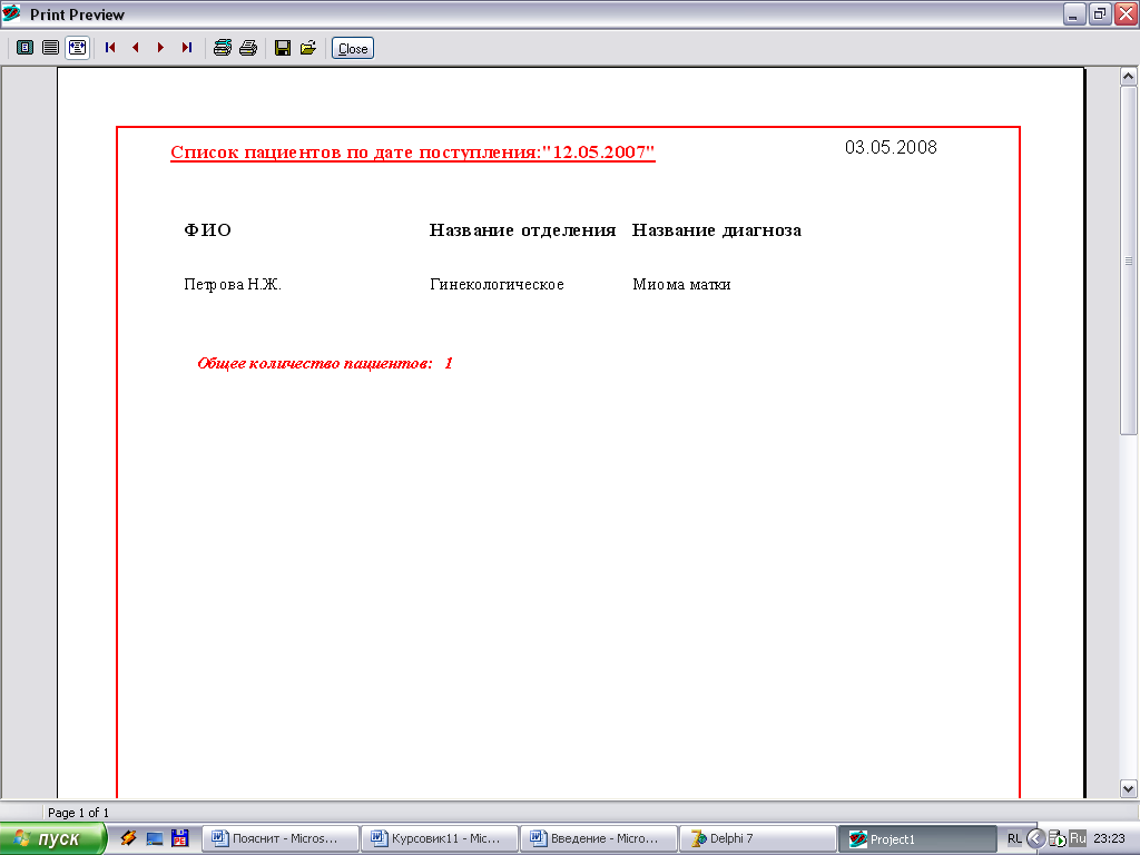6. Отчет "Список пациентов по дате поступления". Вид отчета представлен на рисунке 7.6.