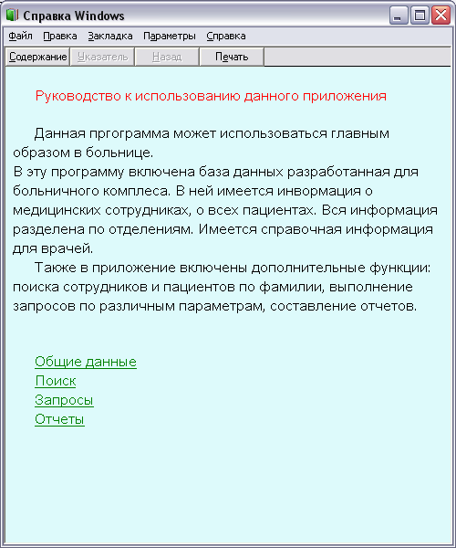 Последняя вкладка главного меню "Справка" содержит всю необходимую справочную информацию для использования данной программы. Окно справки представлено на рисунке 6.14.