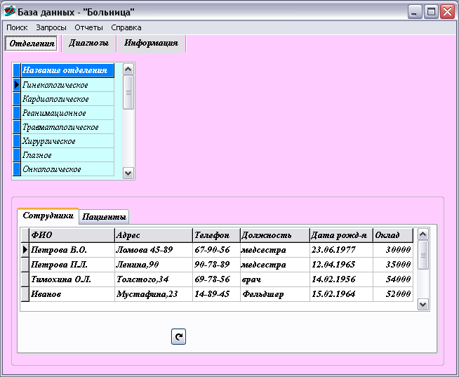В каждом отделении имеются сотрудники и пациенты, которые имеют свои личные данные.