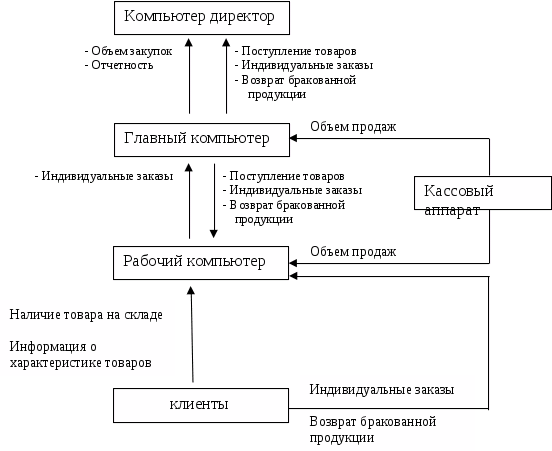 В силу проведенного обследования выяснилось необходимо установить на два уже имеющихся компьютера систему. На одном из компьютеров (главный компьютер) при помощи ИС и будет вестись учет движения товаров и денежных средств, полученных от их реализации. Специалист, которого назначат для работы в магазине, будет заносить данные о приходе товара на склад, о его расходе и перемещениях со склада в торговый зал магазина. В конце каждой недели он должен будет сформировать отчет об остатках товаров на складе и проверить соответствие данных в компьютере с наличием товаров на складе и в торговом зале. Он будет полностью нести ответственность за соответствие данных в компьютере с иными данными на складе. Второй компьютер будет установлен в торговом зале, продавцы-консультанты, могут сами списывать товар с базы, если этот товар находится в торговом зале. А если товара нет в их распоряжении, то они только будут принимать заказ от покупателя, а списывать товар с наличия в базе будет специалист (т.к. он полностью отражает все перемещения товаров в торговый зал).