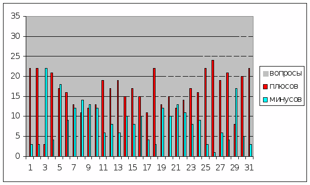 Предложим вашему вниманию диаграмму, которая отображает количество вопросов в тестировании (31), а также количество правильных и неправильных ответов.