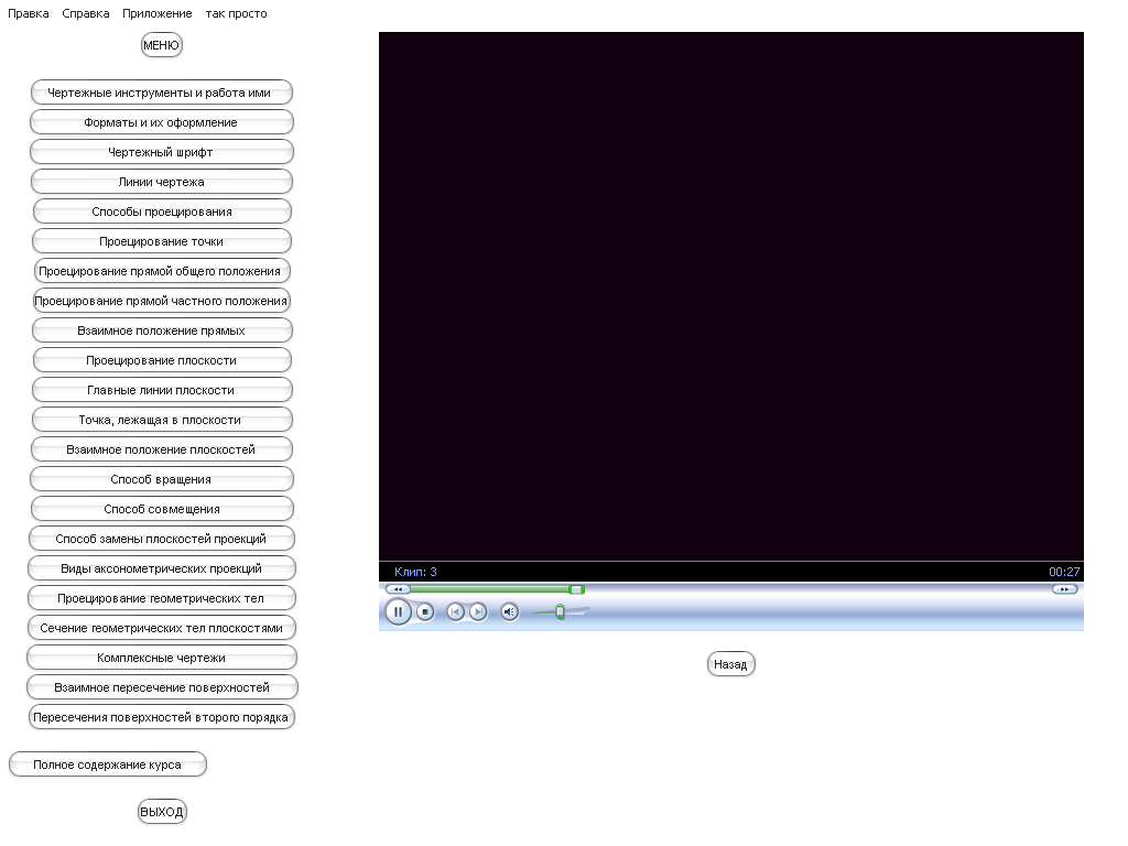 Особенность электронного учебного курса по дисциплине «Начертательная геометрия, инженерная графика» состоит в том, чтобы наглядно изобразить процесс проецирования, сложный для восприятия студентами. Для этого по трудно воспринимаемым темам представлены видеоролики: