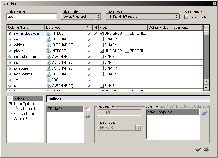 Флаг в поле NN означает, что содержимое данного поля не может быть нулевым ( Not Null ). Флаг в поле AI означает, что значение данного поля в каждой следующей строке увеличивается на 1 (Auto Increment ).