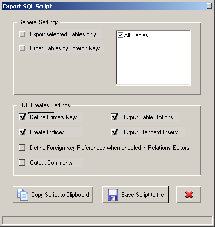 Выбрав необходимые параметры, необходимо нажать Save Script to file. Файл с SQL кодом будет сохранен на диске.