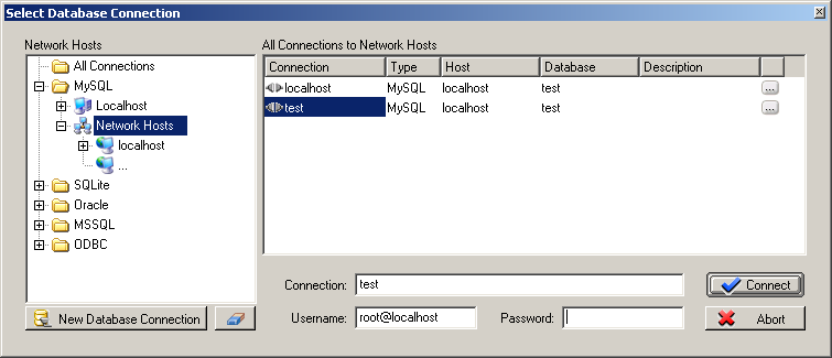 - В центральном окне находится список серверов баз данных, с которыми велась работа и для которых указаны IP-адрес, тип, размещение и название. Так как в данной работе предполагается, что сервер MySQL находиться на локальном компьютере, то все необходимые параметры будут установлены автоматически. Однако при использовании сети, необходимо знать IP-адрес сервера и иметь доступ на работу.