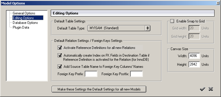 Связь между сущностями определяет связь между будущими таблицами. Для этого необходимо поставить флаг напротив после всех полей в разделе параметры отношений и внешних ключей (раздел Default Relation Settings / Foreign Keys Settings) во вкладке редактирования модели (Editing Options), В программе связи задаются следующим образом.