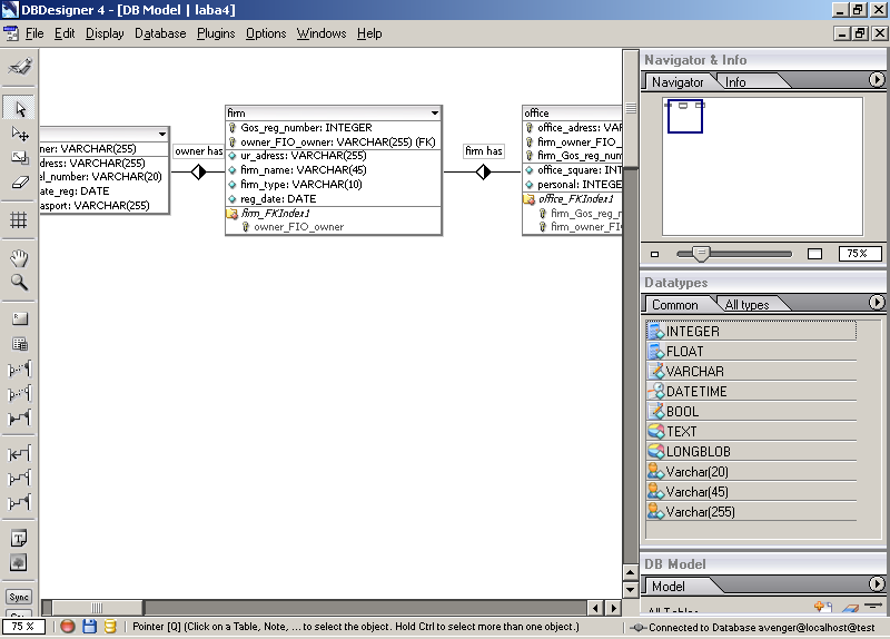 Особенностью программы DBDesigner является то, что в процессе создания ER-диаграмм, отношения будет сформированы автоматически. Это очень удобно при проектировании, т.к. позволяет разработчику не запоминать правила формирования отношений для различных связей между таблицами, а получать все автоматически на основе анализа предметной области.
