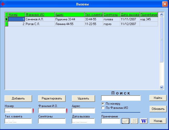 С главной формой также связана форма «Вызовы», в которой осуществляются такие же действия, как и в форме «Кабинеты».