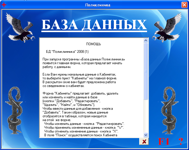Если вам необходимо помощь по работе с базой данных нажмите кнопку «F1» на форме «Поликлиника».