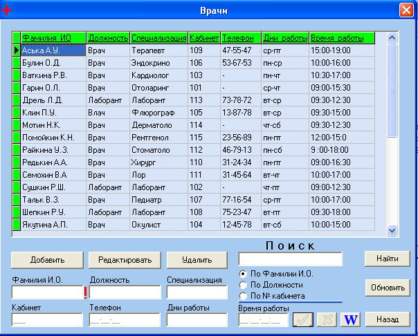 С главной формой также связана форма «Врачи», в которой осуществляются такие же действия, как и в форме «Кабинеты».