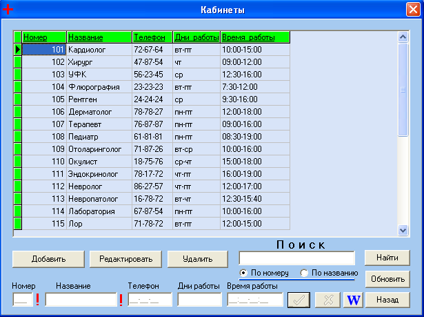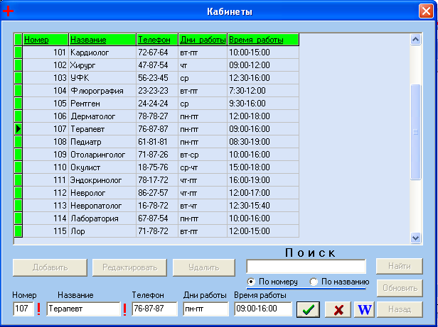 Операции добавление, редактирование, поиск и удаление врачей работают аналогично операциям добавление, редактирование, поиск и удаление кабинетов.