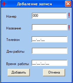 Ели форма будет не заполнена, и вы нажмете кнопку «Добавить», появится форма «Ошибка».