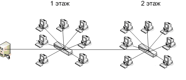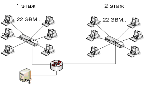 Локальная сеть будет состоять из 40 АРМ, разделенных на 2 сегмента по 20, а также одного общего сервера. Сегментация сети необходима, так как организация занимает двухэтажное здание. Сервер будет находиться на первом этаже.