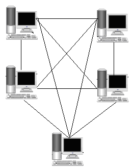 Концепция топологии сети в виде звезды (рис.2.) пришла из области больших ЭВМ, в которой головная машина получает и обрабатывает все данные с периферийных устройств как активный узел обработки данных. Этот принцип применяется в системах передачи данных. Вся информация между двумя периферийными рабочими местами проходит через центральный узел вычислительной сети.
