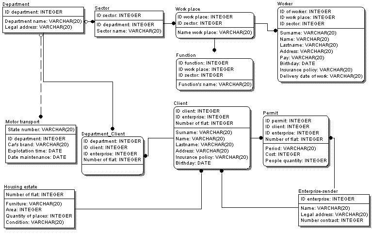 Сущность описывается в диаграмме IDEF1X графическим объектом в виде прямоугольника. Каждый прямоугольник, отображающий собой сущность, разделяется горизонтальной линией на часть, в которой расположены ключевые поля и часть, где расположены неключевые поля. Верхняя часть называется ключевой областью, а нижняя часть областью данных. Ключевая область объекта СОТРУДНИК содержит поле "Уникальный идентификатор сотрудника", в области данных находятся поля "Имя сотрудника", "Адрес сотрудника", "Телефон сотрудника" и т.д.