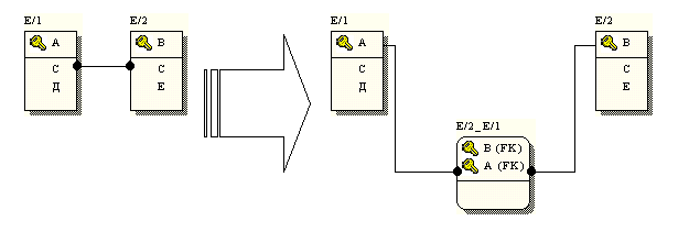 Неидентифицирующие связи, являющиеся уникальными для IDEF1X, также связывают родительскую сущность с дочерней. Неидентифицирующие связи используются для отображения другого типа передачи атрибутов внешних ключей - передача в область данных дочерней сущности (под линией).