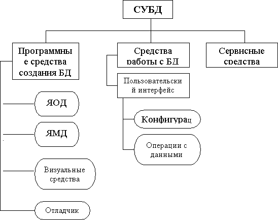 Современная СУБД содержит в своем составе программные средства создания баз данных, средства работы с данными и сервисные средства. С помощью средств создания БД проектировщик, используя язык описания данных (ЯОД), переводит логическую модель БД в физическую структуру, а на языке манипуляции данными (ЯМД) разрабатывает программы, реализующие основные операции с данными (в реляционных БД – это реляционные операции) (см. рис. 2.1). При проектировании привлекаются визуальные средства, т.е. объекты, и программа-отладчик, с помощью которой соединяются и тестируются отдельные блоки разработанной программы управления конкретной БД.