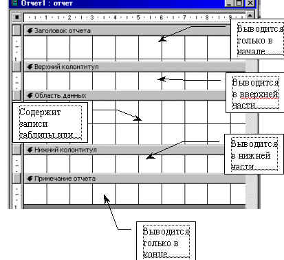 Сведения в отчете могут быть разбиты на разделы. Все отчеты содержат область данных, но отчет также может включать разделы заголовка отчета, верхнего колонтитула, нижнего колонтитула и примечания отчета. Каждый раздел отчета имеет свое предназначение и печатается в определенном порядке.