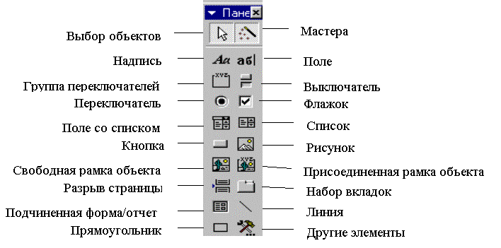 Для несвязанных элементов управления источника данных не существует. Такие элементы управления используются для отображения линий, прямоугольников, рисунков. Ввод в проект формы (отчета) несвязанного элемента управления осуществляется так: на панели элементов производится щелчок по кнопке нужного элемента управления, а затем щелчок в том разделе проекта, где требуется разместить этот элемент.