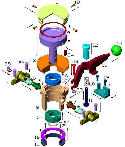 10. Надеваем на нижнюю часть вала шарикоподшипник (поз. 25), закрепляем его с помощью кольца (поз. 27), вставляемого в проточку вала