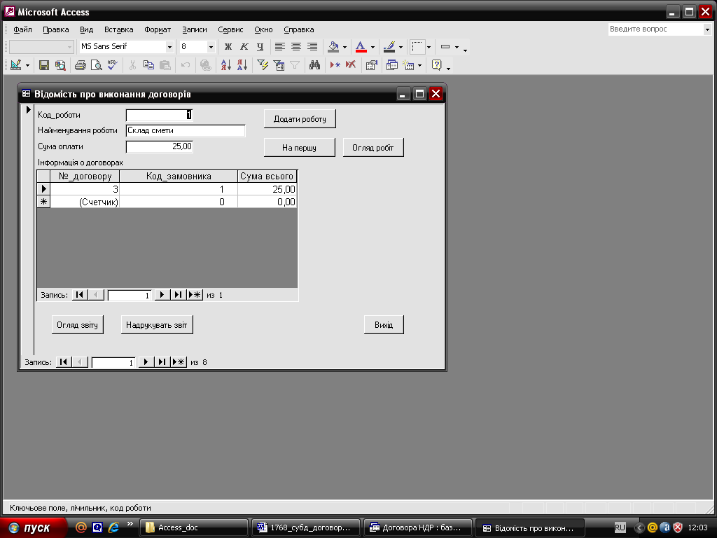 Ієрархічна форма Відомість для виконання договорів для вводу та модифікації даних в таблиці Дані оплати договорів і Інформація о договорах зображена на рис.8.