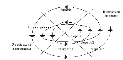 Для подолання перерахованих проблем була запропонована спіральна модель ЖЦ (Рис. 2.3), що робить упор на початкові етапи ЖЦ: аналіз і проектування. На цих етапах реалізовується технічних рішень перевіряється шляхом створення прототипів. Кожен виток спіралі відповідає створенню фрагмента або версії ПЗ, на ньому уточнюються цілі і характеристики проекту, визначається його якість і плануються роботи наступного витка спіралі. Таким чином заглиблюються і послідовно конкретизуються деталі проекту і в результаті вибирається обґрунтований варіант, який доводиться до реалізації.