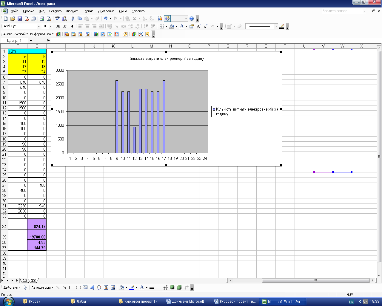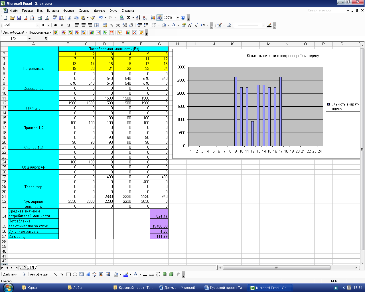 При проектуванні офісу нам знадобиться 94,93 м кабелю. Добове споживання електроенергії складає 19,78 кВт*година, та місячні витрати за споживання електроенергії буде складати – 142,89 гривень.