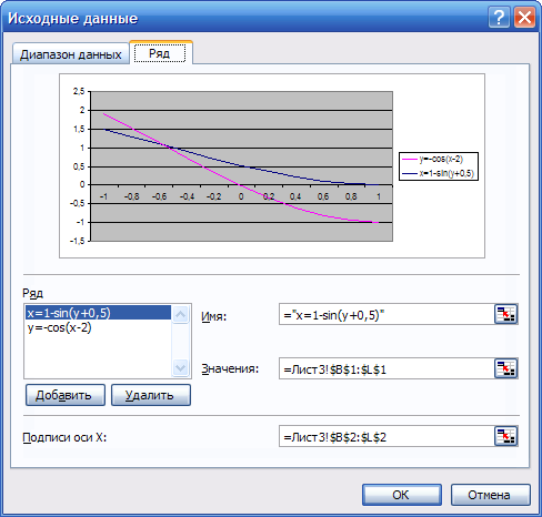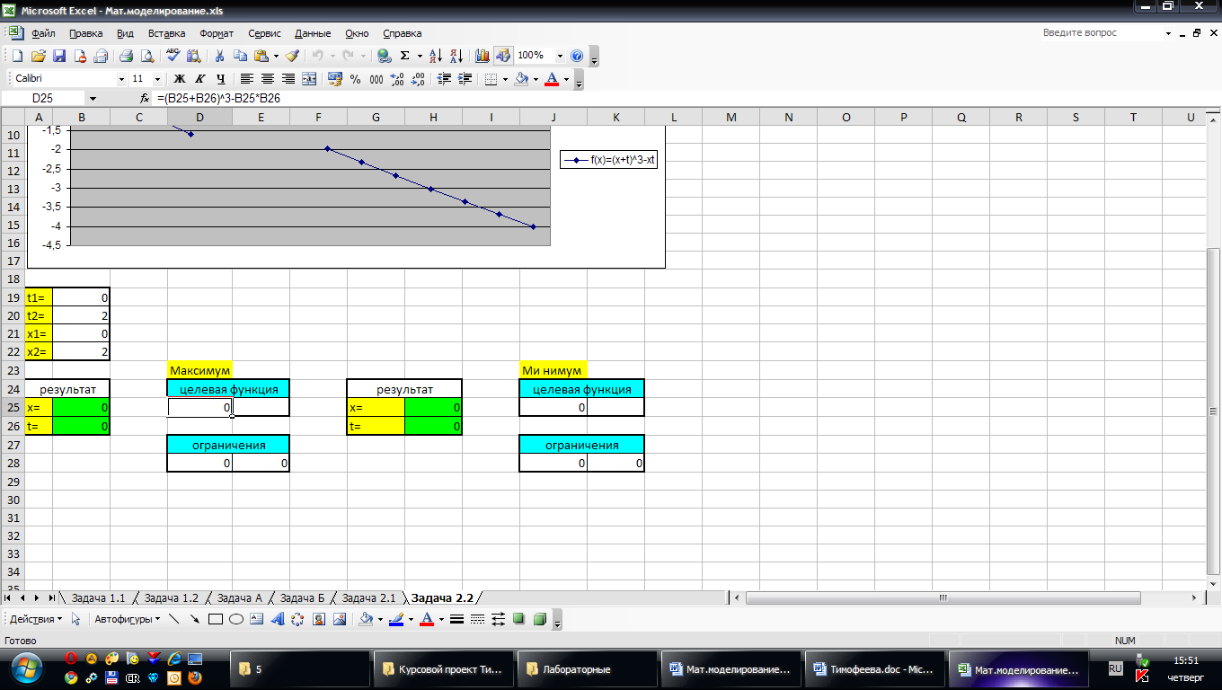 На цьому графіку можна чітко визначити крапку мінімуму й крапку максимуму, але для точності необхідно заповнити таблицю з вихідними даними й розрахунковими формулами. Задаємо початкові значення х и y рівні "1".