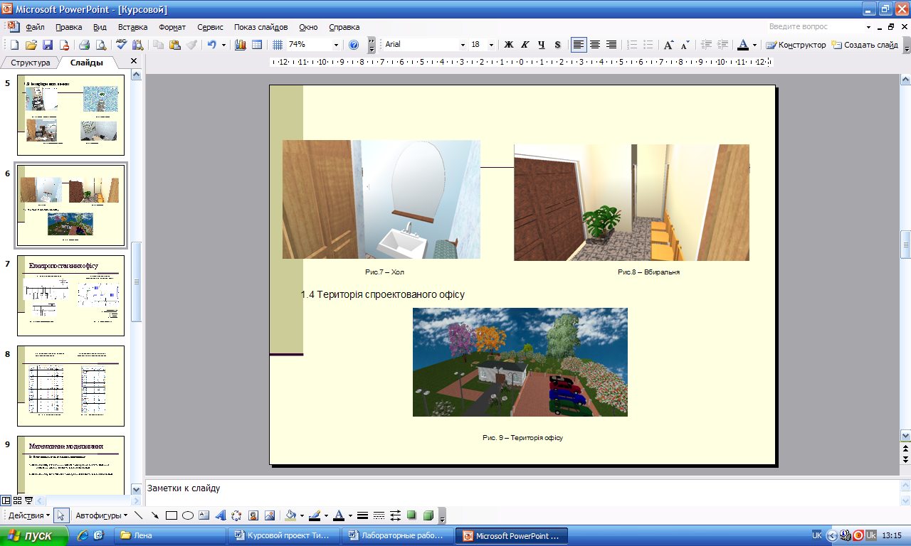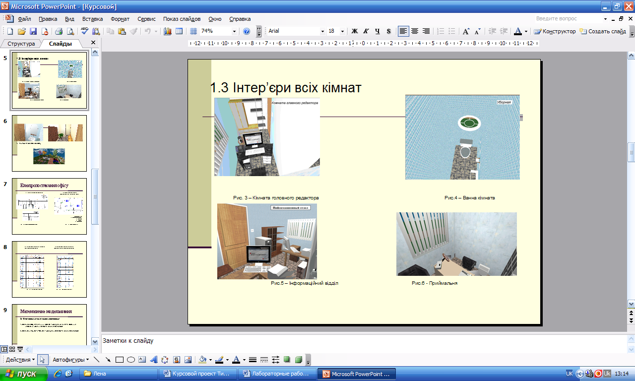 Проект офісу складається з 6 кімнат: хол, кімната головного редактора, інформаційний відділ, вбиральня, ванна кімната, приймальня.