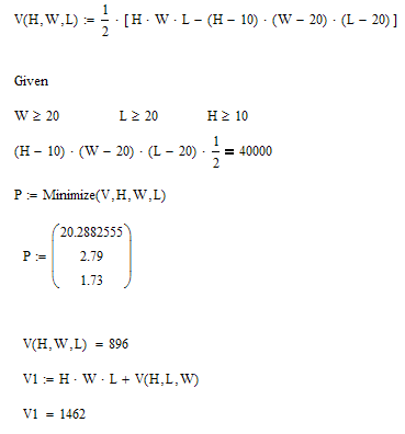 Так як наша задача полягає у знаходження мінімальної кількості матеріалу для виготовлення ємності, ми скористуємося функцією Minimize.