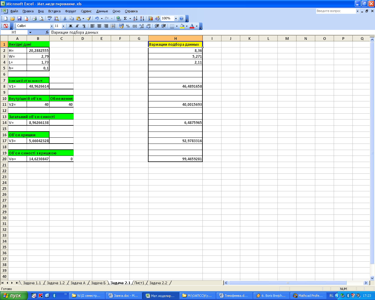 Завдання 2.1 (Задача 7) - Н=20,3 м; W=2,79 м; L=1,73 м. Об’єм ємності, що має кришку сягає 1462 куб. м.