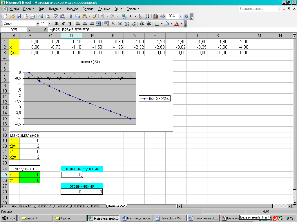 Для рішення даного завдання необхідно заповнити таблицю. Задаємо значення t=[0,2]. Задаємо функцію f(x), у якій початкове значення х буде дорівнює "0".