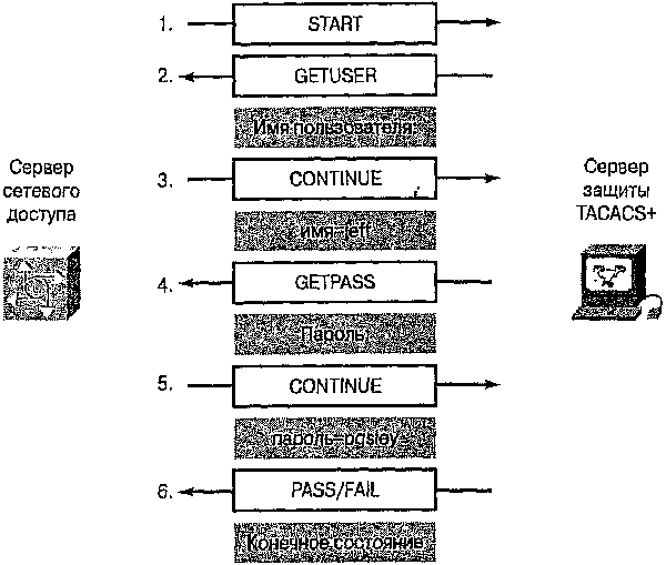 Сервер сетевого доступа запрашивает имя пользователя и посылает введенное имя серверу защиты TACACS+ в пакете CONTINUE.