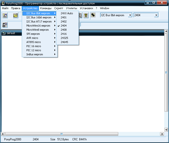 Далее в меню «Устройство» необходимо установить тип микросхемы 2404, как показано на рисунке 21.