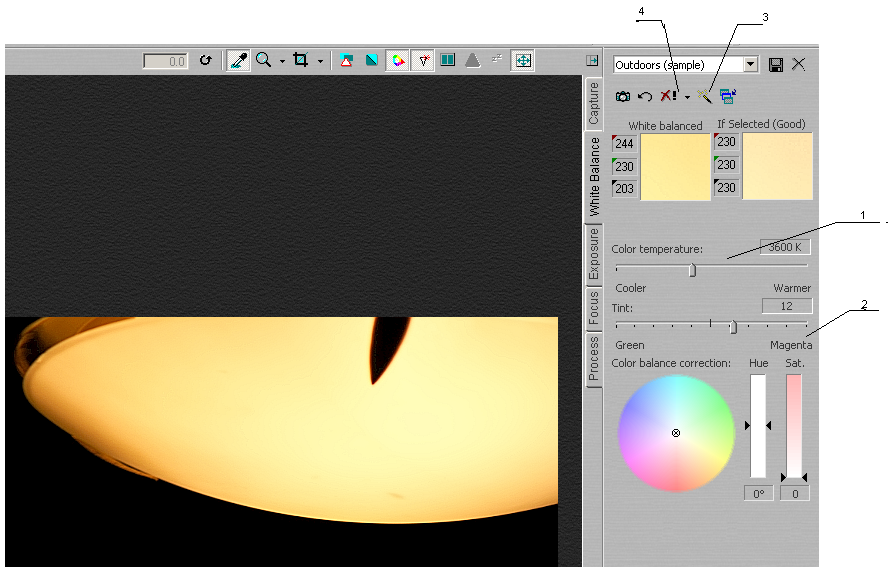 Баланс белого выбирается из предложенных вариантов освещения, либо с помощью клика мышки на белый участок;