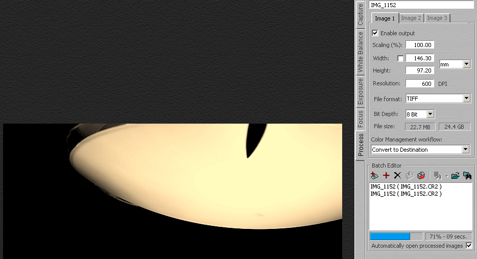 На рисунке 7 изображен процесс преобразования кадра в формате RAW в TIFF с глубиной цвета 8bit. Во вкладке Process также можно установить формат JPEG разног качества, изменить размеры полученного файла, изменить его название и прочие операции изменения файла на выходе.