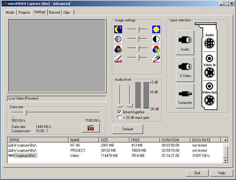 В меню Input Selections мы выбираем входы, по которым у нас будет подаваться аудио-сигнал и видеосигнал, в данном случае видео по кабелю S-Video. Video out нам не нужен, так что его мы не трогаем. Меню Image Settings позволяет откорректировать видео изображение, которое уже будет в цифровом формате. Так как существует такая проблема как искажения в цветовой гамме исходника и результата. Определённого стандарта не существует, поэтому коррекция идёт на глаз. В параметре Data rate в соответствии с приведёнными выше рекомендациями компрессии видео с VHS носителя выбираем компрессию 15.00:1 а Date rate 1440 KB/s.