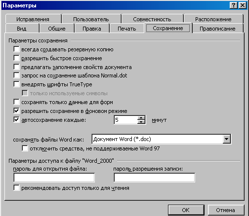 1. Выбрать команду Файл –> Сохранить как и в открывшемся окне нажать кнопку Параметры, или выбрать команду Сервис –> Параметры.