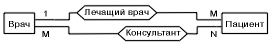 (пацієнт, маючи одного лікуючого лікаря, може мати також трохи лікарів-консультантів; лікар може бути лікуючим лікарем декількох пацієнтів і може одночасно консультувати кілька інших пацієнтів);