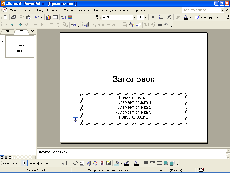 Как правило, основой любой презентации является текстовая информация, которую можно условно разделить на следующие элементы: обычный текст, заголовок, подзаголовок, маркированный список. Существует несколько основных возможностей по добавлению текста в очередной слайд, которые зависят от способа создания презентации:
