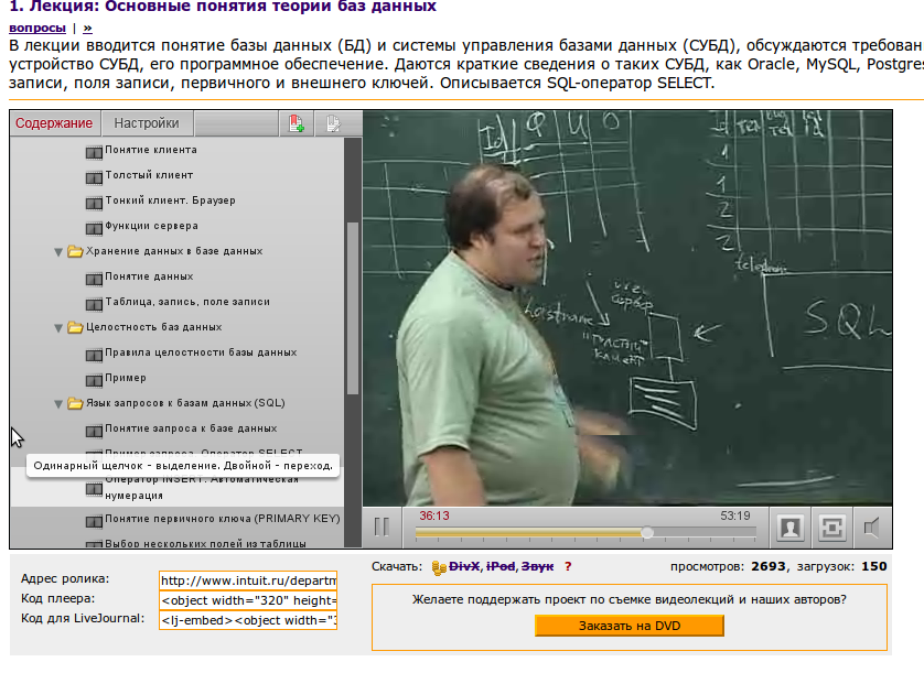 Также стоит отметить, что на проекте существует форум (на данный момент закрытый), в котором шли обсуждения на тему улучшения видеолекций. Форум соответственно предполагал наличие учетных записей, которые хранились в базе данных этого проекта. Какого-то механизма загрузки видеолекций найти не удалось, но сами видеофайлы хранятся на сервере проекта.
