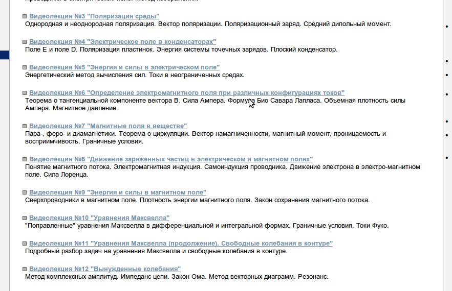 Вторым аналогом можно назвать портал видеолекций Московского физико-технического института (http://fvl.fizteh.ru/). Проект явно реализовывался под какую-то конкретную задачу, поскольку за последние 6 месяцев на него не было загружено ни одной видеолекции. Главным достоинством данного проекта является возможность создания курсов, таким образом обучающийся сможет проходить курс, просматривая видеолекции по порядку. На рисунке 3 представлен курс видеолекций на тему “Электричество и магнетизм”.