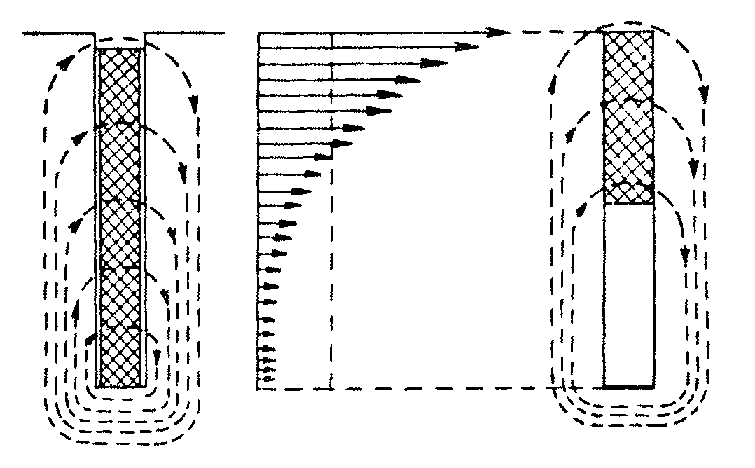 В двигателях с глубокими пазами на роторе его короткозамкнутая обмотка выполняется в виде тонких высоких полос (рисунок 2.4). При такой конструкции обмотки происходит оттеснение тока к верхней части проводников вследствие того, что нижние части проводников сцеплены с большим числом магнитных линий потока рассеяния, чем верхние части.