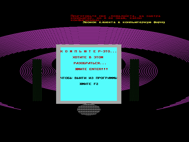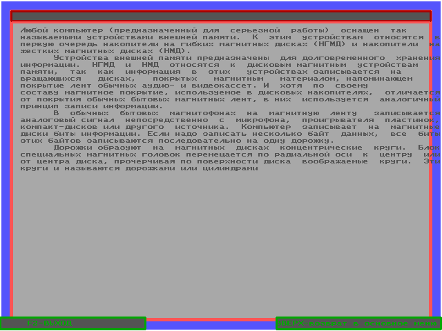 В случае выбора пункта "информационный материал" пользователь получает доступ еще к одному меню, который содержит девять пунктов: системный блок, материнская плата, процессор, видеокарта, звуковая карта, блок питания, слоты памяти, cd-rom, выход. Каждому пункту меню соответствует свой текстовый файл, хранящийся на жестком диске. Пункт "выход" завершает программу.