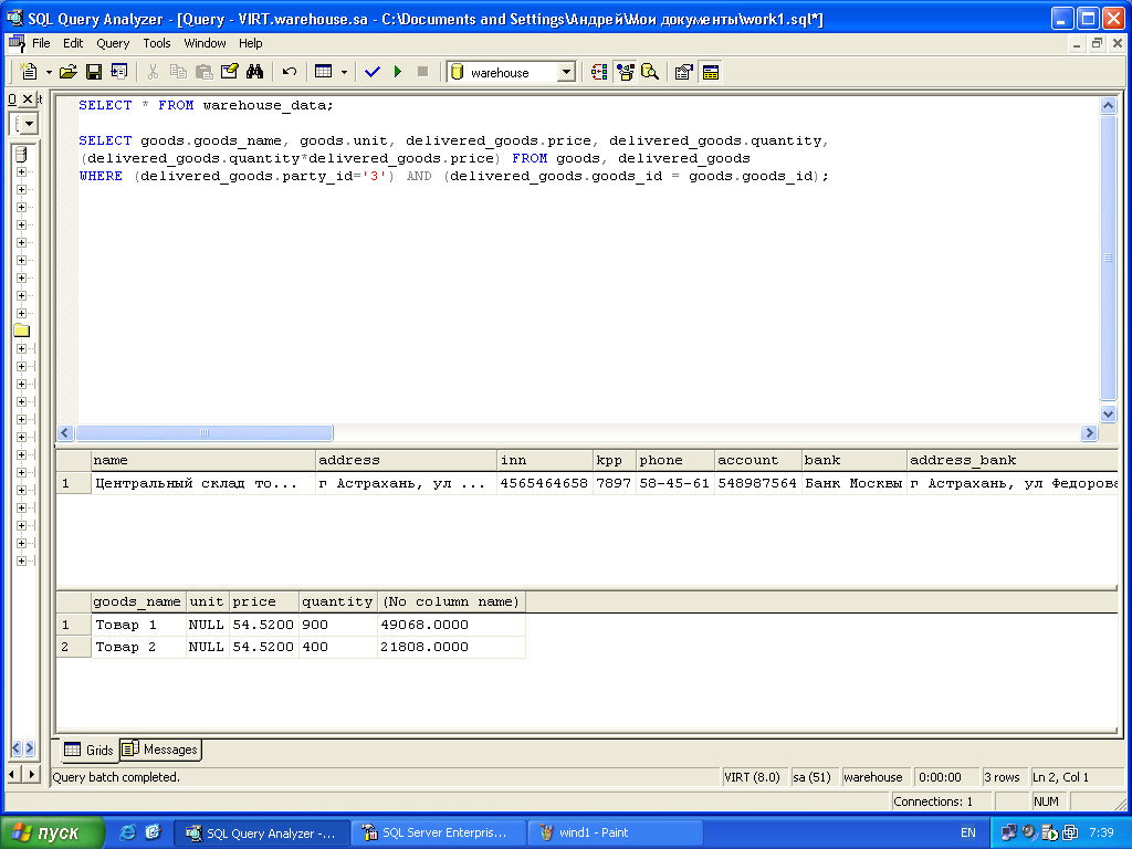 Спроектировать информационную систему учета товаров на оптовом складе в среде СУБД MS SQL Server.