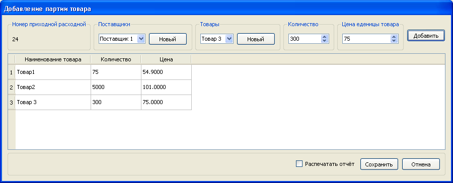 На форме находятся элементы ввода для выбора поставщика, товара, его стоимости и количества. Если усановленя опция «Распечатать отчёт», то после нажатия кнопки «Сохранить» открывается форма предварительного просмотра и приходной накладной, с возможностью последующей печати. В группах «Поставщики» и «Товары» присутствуют кнопки «Новый» при нажатии на которые открываются диалоги для добавления новых поставщиков.