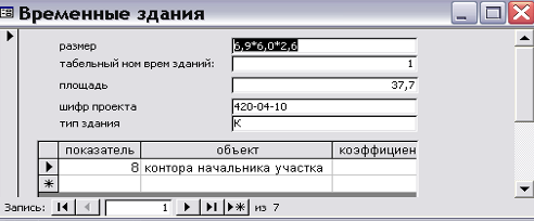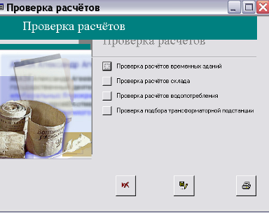 Для ввода информации служат кнопки «Расчёт временных зданий», «Расчёт склада», «Расчёт водопровода», «Расчёт энергопотребления», расположенная в главной кнопочной форме на сервере, которая открывает кнопочные формы отделов «Временные здания» «Склад», «Водопровод», «Трансформаторная подстанция». Даныеформа представлены на рис. 3,4,5,6.