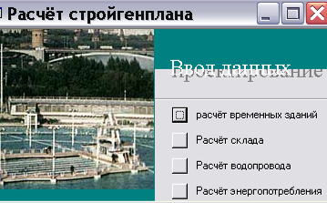 Главная кнопочная форма клиентского приложения «Расчёт стройгенплана» представлена на следующем рисунке.