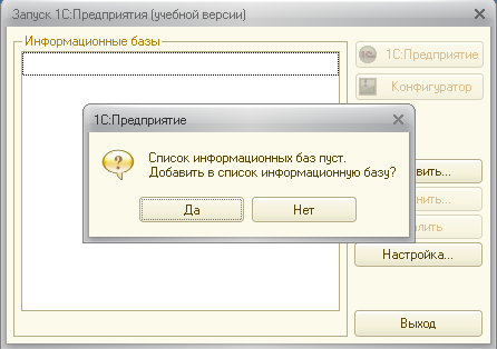 Первым делом система откроет список информационных баз, с которыми мы можем работать, и обнаружит, что этот список пуст. В нем нет еще ни одной информационной базы. Система сразу же предложит добавить в список информационную базу.