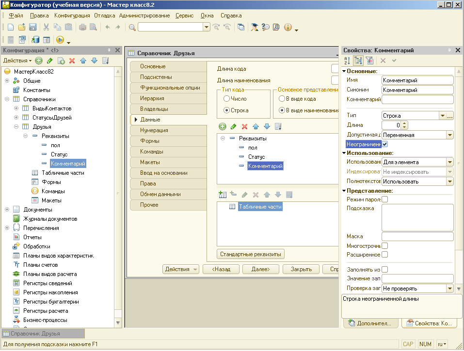 Остался реквизит Комментарий, в который мы решили записывать все мысли и заметки, касающиеся нашего знакомого. Добавляем этот реквизит. Тут нас устраивает вариант типа по умолчанию - Строка. Не устраивает только длинна этой строки, в которую никакая заметка не поместится. А чтобы не гадать, хватит нам длины строки или нет, установим для Комментария строку неограниченной длины.